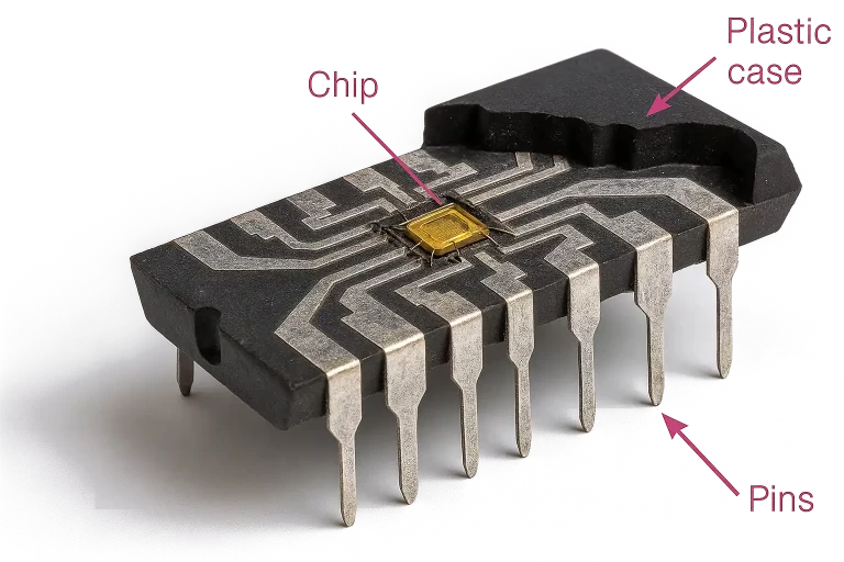 Silicon Die is a small piece cut from a silicon wafer, containing microscopic circuits made through photolithography and deposition. It houses transistors, resistors, capacitors, and interconnects that perform the IC’s logic, memory, signal processing, or power functions.
