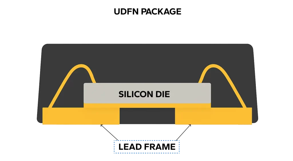 The Ultra Dual Flat No-Lead (UDFN) package is a thin, miniaturized version of the DFN, often under 0.5 mm thick. With a flat, leadless body and metal pads on the underside, it saves board space, reduces profile height, and improves electrical performance by minimizing lead inductance.