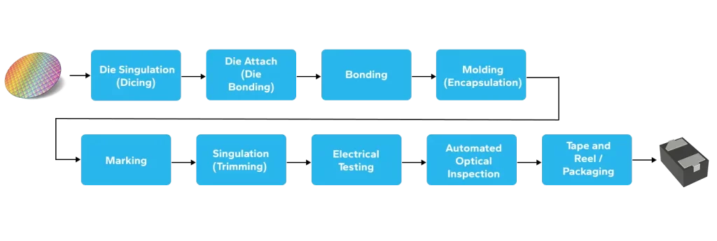The semiconductor die is mounted onto the lead frame or substrate using adhesive materials or solder. Die attach is critical for mechanical stability and thermal performance.