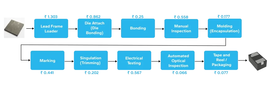 According to the xcPEP analysis it was found that 79.27% (₹88.624) of the total assembly cost comes from raw materials such as the silicon die, lead frame, bonding wire, die adhesive, and encapsulation epoxy. Around 16.7% (₹18.67) of the cost is attributed to overheads, which include indirect expenses like facility rent, utilities, administrative charges, maintenance, and other miscellaneous costs. The remaining 4.03% (₹4.502) is associated with process-related expenses.