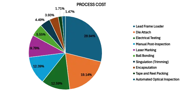 Upon detailed process analysis using xcPEP, the chart below illustrates the distribution of process costs in percentage. Among the various assembly steps, the Lead Frame Loader emerges as the most cost-intensive process, contributing approximately 6.98% and 28.94% of overall process cost of the overall cost. This highlights its significant impact compared to other processes in the IC assembly workflow. By applying should costing of semiconductor processes, each step – from die attach and ball bonding to encapsulation and testing – can be evaluated for its exact cost contribution, giving engineers and procurement teams actionable insights