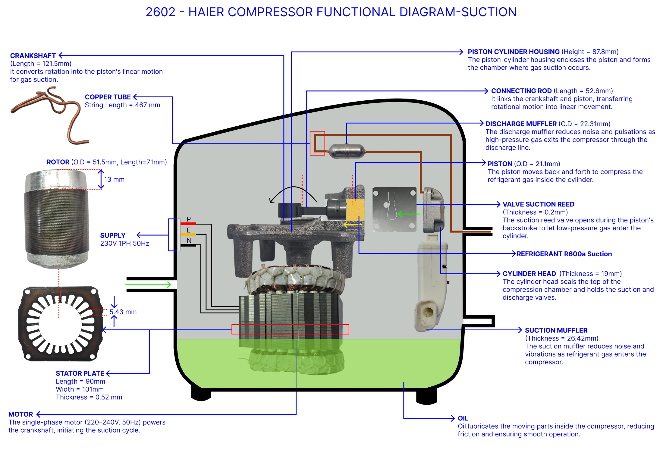 In the suction phase, the single-phase induction motor (230 V, 50 Hz) rotates the crankshaft, which transfers motion through the connecting rod to drive the piston downward inside the cylinder housing. This increases the internal chamber volume and creates a low-pressure zone, causing the valve suction reed to lift. Low-pressure R600a refrigerant from the evaporator is then drawn into the cylinder through the suction muffler, which reduces intake noise and vibration. Lubricating oil in the crankcase coats the moving parts, ensuring smooth operation and minimizing wear — factors that can impact service life and maintenance costs.