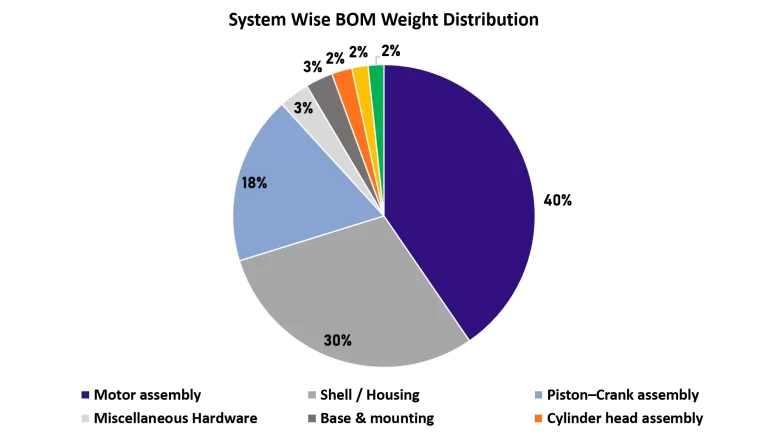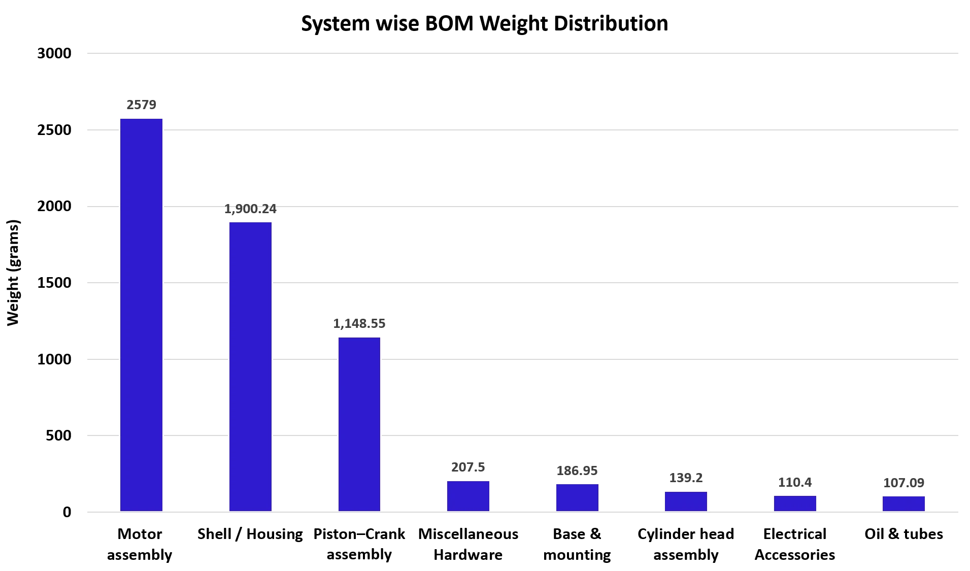 A key step in compressor benchmarking and should-cost analysis is understanding how weight is distributed across subassemblies. Since material cost often scales with weight, the BOM weight distribution highlights major cost drivers.