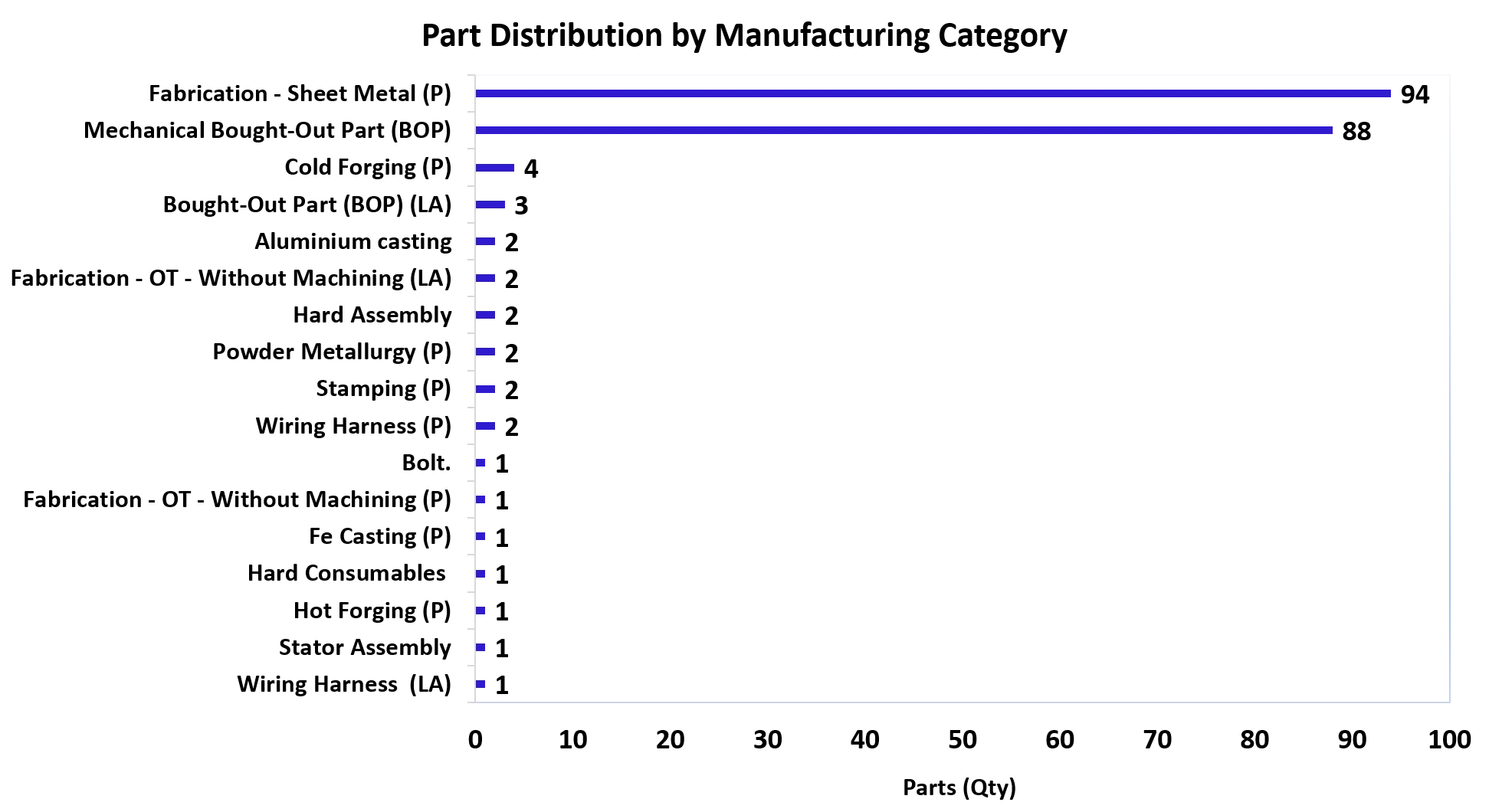 1. Fabrication – Sheet Metal (P) (45.9%) and Mechanical Bought-Out Part (BOP) (43.9%): Account for the majority of parts, reflecting the extensive use of sheet metal components
