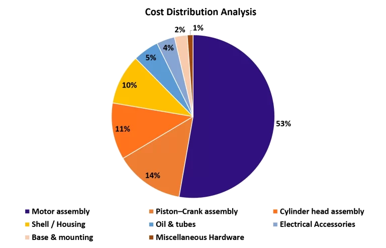 The compressor was analyzed to estimate its manufacturing cost using a detailed should-costing approach. The study considered factors such as material costs, labor, production volumes, and component sourcing. Key insights from the analysis are summarized below: