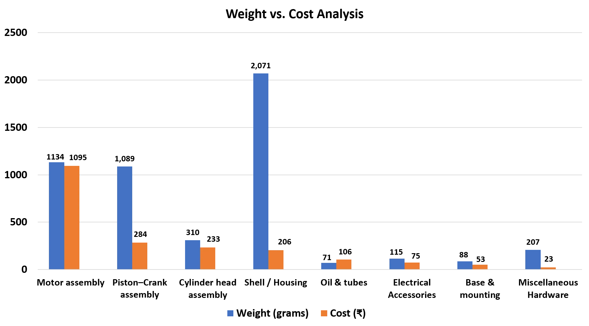 • Piston–Crank Assembly – At 18% of weight and 12% of cost, this subassembly shows balanced weight-to-cost contribution, reflecting efficiency in material usage.