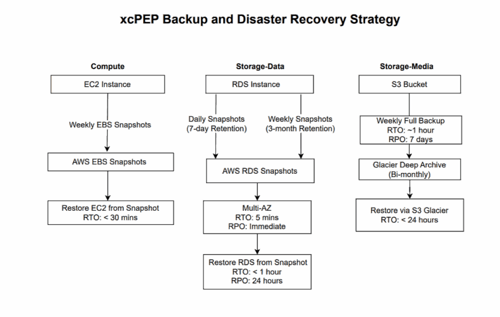 Disclaimer: This diagram outlines xcPEP's current approach to data backup and recovery. The information provided is "as is" and for general informational purposes only. It is not intended to create any warranties or commitments regarding the performance, functionality, or availability of the xcPEP platform or its underlying infrastructure. Our systems and procedures are continuously monitored, improved, and subject to change without prior notice. We encourage you to consult our latest Trust Center documentation for the most accurate and up-to-date information.